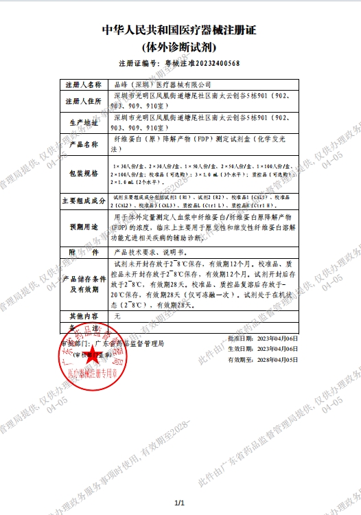 粵械注準20222401128/廣州科方生物技術股份有限公司 有效期至:2027-08-10纖維蛋白(原)降解產物(FDP)測定試劑盒(化學發(fā)光法)