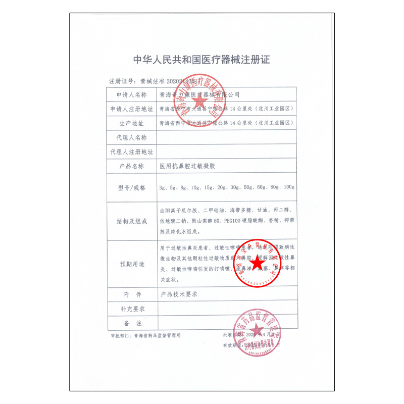 晉械注準(zhǔn)20252140130/星禾藥業(yè)(山西)集團(tuán)有限公司 有效期至:2030-07-22醫(yī)用抗鼻腔過敏凝膠