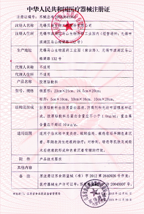 蘇食藥監(jiān)械(準(zhǔn))字2012第2640926號(hào)/無(wú)錫貝迪生物工程有限公司 有效期至:2016-12-05膠原貼敷料