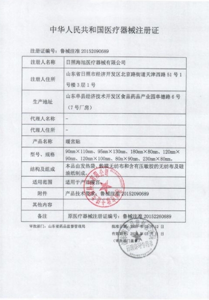 魯械注準(zhǔn)20152090592/山東朱氏藥業(yè)集團(tuán)有限公司 有效期至:2025-03-09暖宮貼