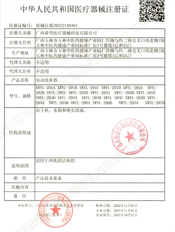 桂械注準(zhǔn)20222140196/廣西攜健生物科技有限公司 有效期至:2027-07-07電動洗鼻器