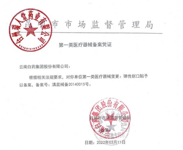 備案人-組織機(jī)構(gòu)代碼由“21652214-X”變更為“9153000021652214XX”;備案人-注冊(cè)地址由“昆明市呈貢區(qū)云南白藥街3686號(hào)”變更為“云南省昆明市呈貢區(qū)云南白藥街3686號(hào)”變更時(shí)間2021年07月27日\(chéng)\n產(chǎn)品名稱-中文由“彈性創(chuàng)可貼”變更為“彈性創(chuàng)口貼”;產(chǎn)品描述由“由接觸創(chuàng)面的敷墊、背貼和保護(hù)層(臨用前去除)組成。不含藥物?!弊兏鼮椤坝赏磕z基材、吸收性敷墊、防粘連層和可剝離的保護(hù)層組成的片狀創(chuàng)口貼。其中吸收性敷墊采用可吸收滲出液的材料制成。不含有發(fā)揮藥理學(xué)、免疫學(xué)或者代謝作用的成分。不包含附錄所列成分。所含成分不可被人體吸收。非無菌提供,一次性使用?!保活A(yù)期用途由“用于真皮淺層及其以上的淺表性小創(chuàng)傷、擦傷等,為淺表創(chuàng)面、皮膚損傷提供愈合環(huán)境。”變更為“用于小創(chuàng)口、擦傷、切割傷等淺表性創(chuàng)面的急救及臨時(shí)性包扎?!弊兏鼤r(shí)間2022年03月11日\(chéng)\n變更了技術(shù)要求。\\n變更了產(chǎn)品技術(shù)要求。變更時(shí)間2022年11月30日\(chéng)\n生產(chǎn)地址由“昆明市呈貢新區(qū)云南白藥集團(tuán)股份有限公司”變更為“昆明市呈貢新區(qū)云南白藥集團(tuán)股份有限公司;江蘇武進(jìn)經(jīng)濟(jì)開發(fā)區(qū)果香路1號(hào)”。變更時(shí)間2023年4月14日