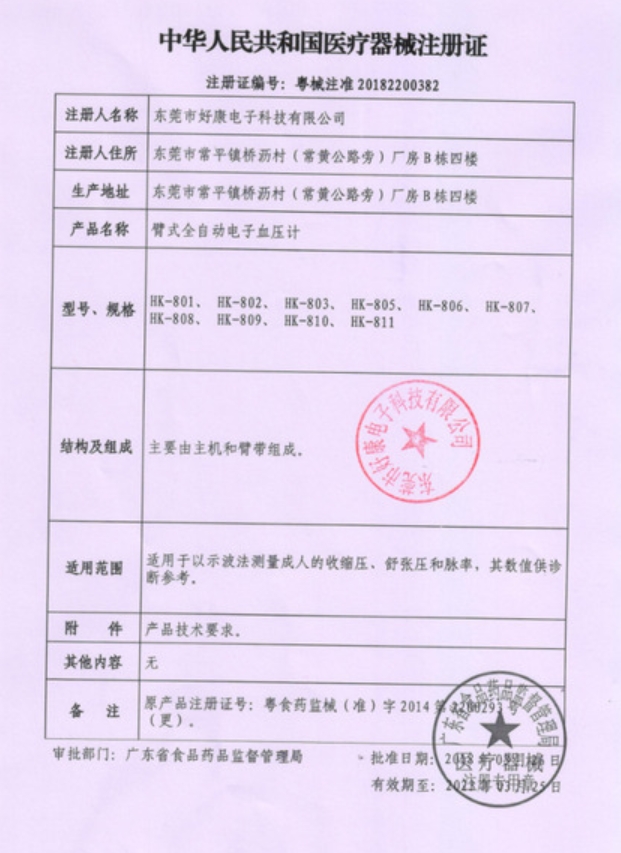 粵食藥監(jiān)械(準(zhǔn))字2014第2200293號(更)/東莞市好康電子科技有限公司 有效期至:2018-03-13臂式全自動電子血壓計