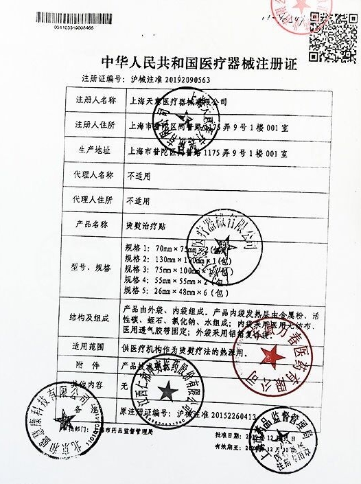 滬械注準20152260413/上海天意醫(yī)療器械有限公司 有效期至:2020-06-25燙熨治療貼