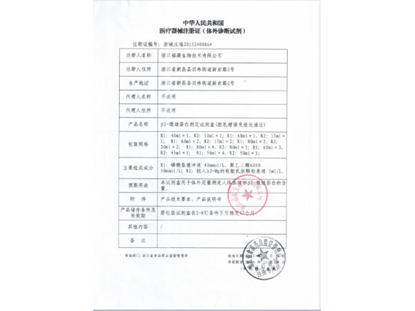 浙食藥監(jiān)械(準(zhǔn))字2012第2400554號(hào)/浙江維益生物科技有限公司 有效期至:2016-10-29β2-微球蛋白測定試劑盒(膠乳增強(qiáng)免疫比濁法)