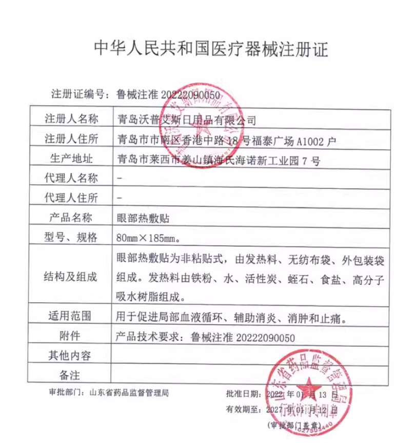 青械注準20242090001/青海奇力康醫(yī)療器械有限公司 有效期至:2029-01-02眼部熱敷貼