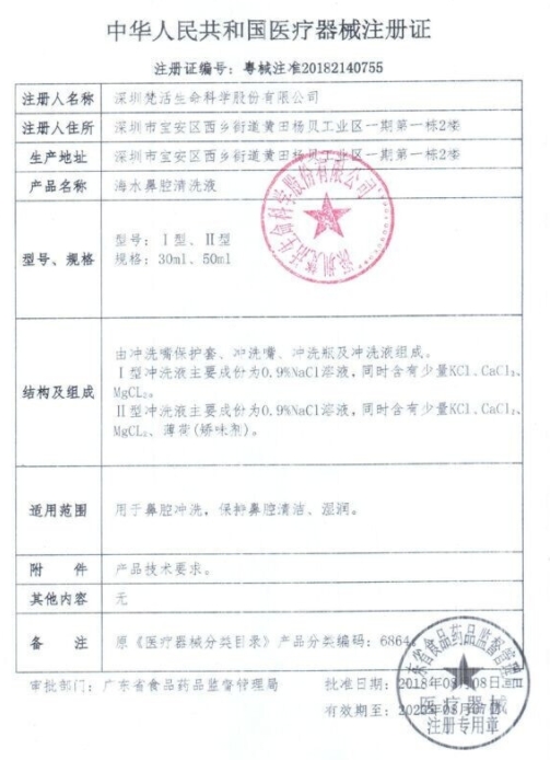 吉械注準20222140678/吉林普澤生物醫(yī)藥有限公司 有效期至:2027-08-28海水鼻腔清洗液
