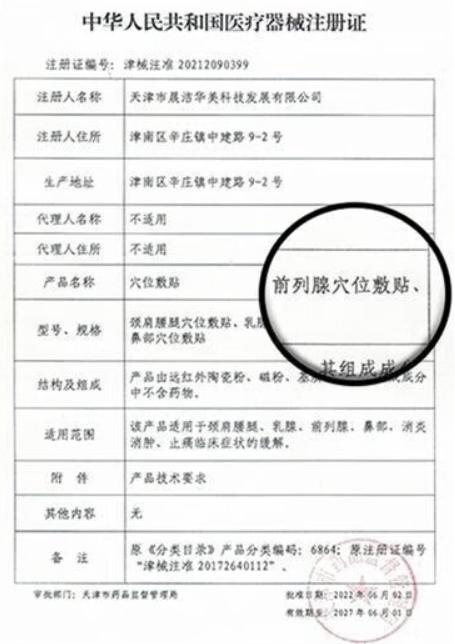 津械注準(zhǔn)20172640112/天津市晨潔華美科技發(fā)展有限公司 有效期至:2022-06-01穴位敷貼