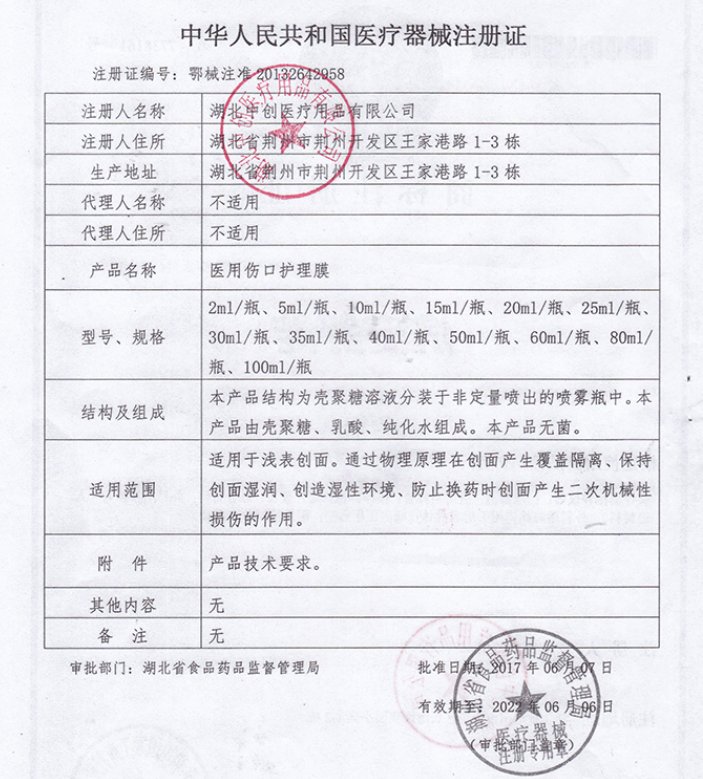 鄂食藥監(jiān)械(準(zhǔn))字2010第2642958號(hào)/湖北中創(chuàng)醫(yī)療用品有限公司 有效期至:2014-07-22醫(yī)用傷口護(hù)理膜