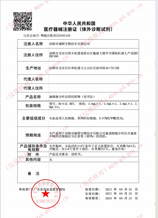 粵械注準20232400699/深圳市瑞圖生物技術有限公司 有效期至:2028-04-23血細胞分析儀用校準物(光學法)