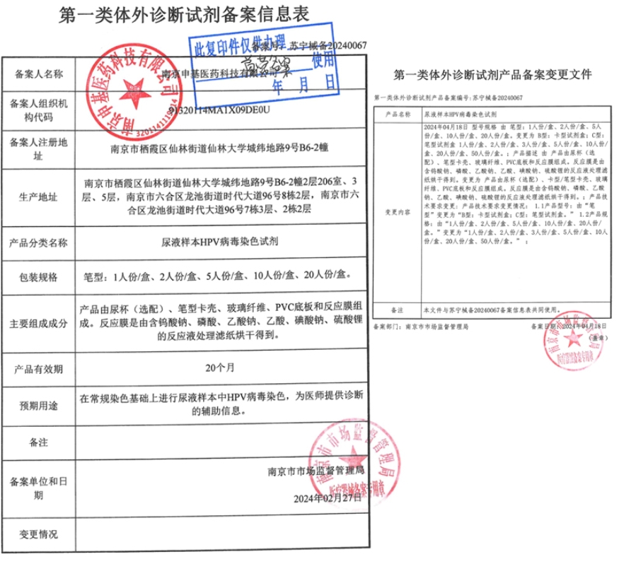 蘇寧械備20240170/南京申基醫(yī)藥科技有限公司尿液樣本HPV病毒染色試劑