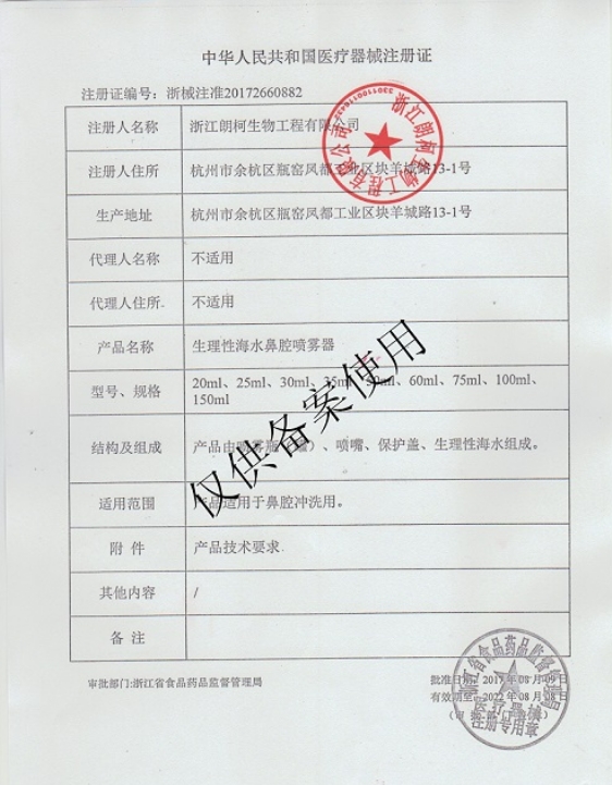 鄂械注準20152642183/武漢啟捷科技開發(fā)有限公司 有效期至:2020-11-26生理性海水鼻腔噴霧器