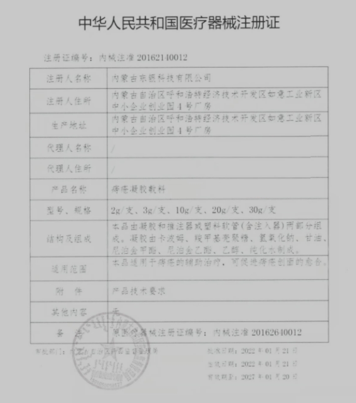吉械注準(zhǔn)20222140244/吉林惠澤生物醫(yī)藥有限公司 有效期至:2027-06-15痔瘡凝膠敷料