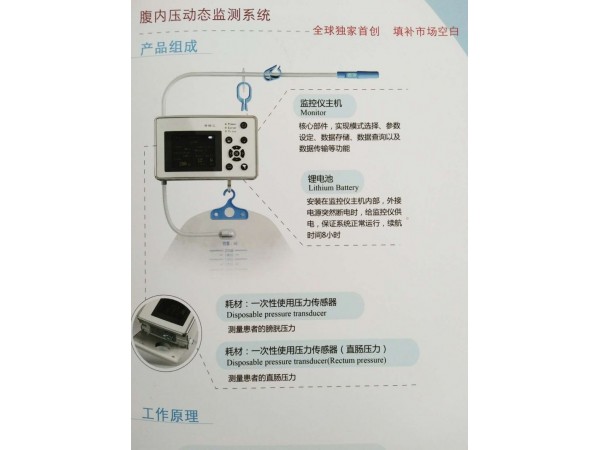 產(chǎn)品由主機(jī)、一次性使用壓力傳感器、一次性使用壓力傳感器(直腸壓力)、手持放尿開關(guān)、電池、電源適配器組成。
