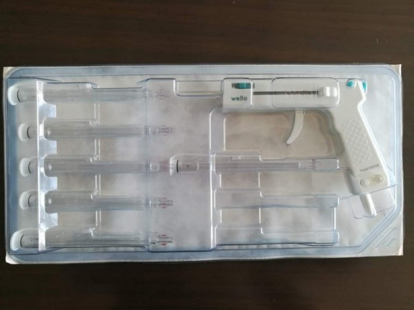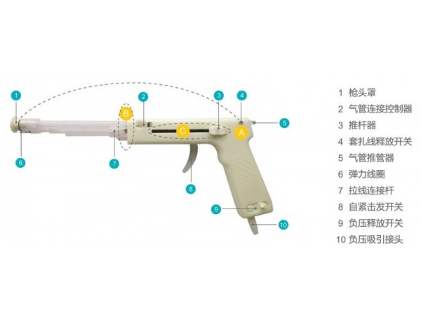 由槍體、槍管、彈力線、負壓吸引接頭、繞線輪、套扎器開關(guān)和蓋帽組成,其中A型配置3發(fā)彈力線;B型配置單發(fā)彈力線。