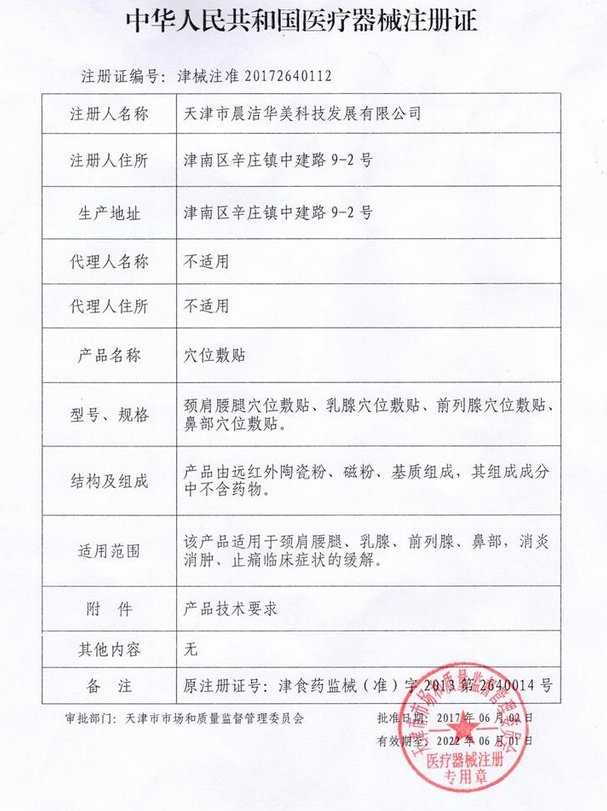 津械注準20212090399/天津市晨潔華美科技發(fā)展有限公司 有效期至:2027-06-01穴位敷貼