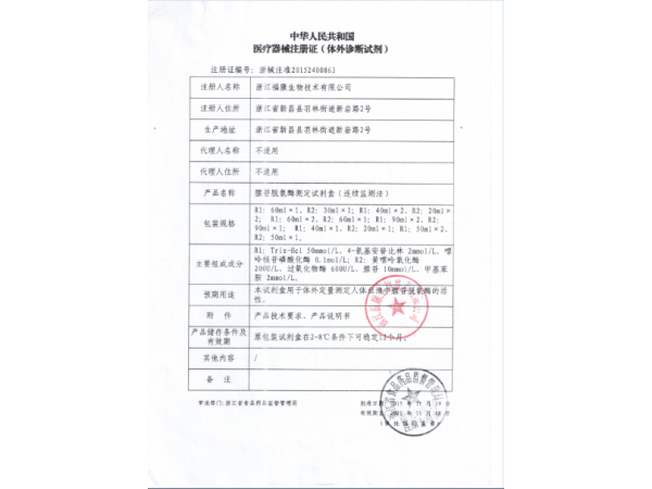 浙食藥監(jiān)械(準(zhǔn))字2012第2400015號(hào)/浙江福康生物技術(shù)有限公司 有效期至:2016-01-11腺苷脫氨酶測(cè)定試劑盒(連續(xù)監(jiān)測(cè)法)