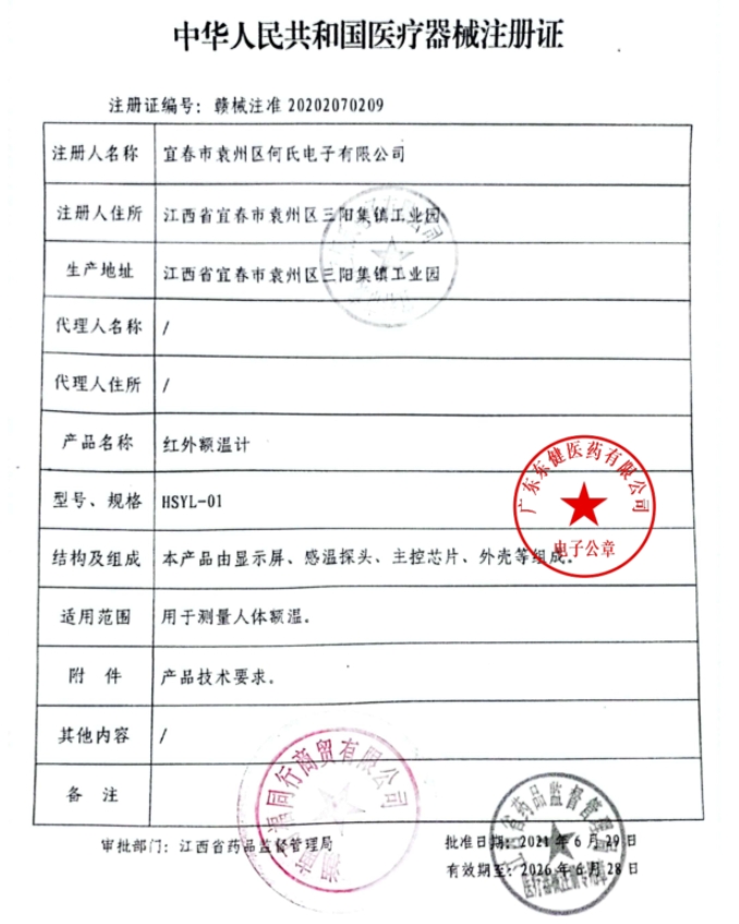 閩械注準20202070443/泰好康電子科技(福建)有限公司 有效期至:2025-09-24紅外額溫計