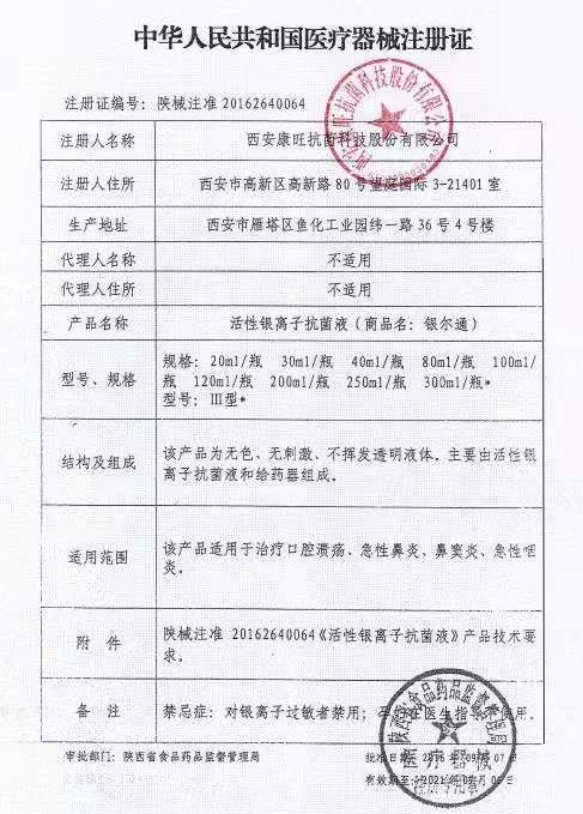 該產(chǎn)品為無(wú)色、無(wú)刺激、不揮發(fā)透明液體。主要由活性銀離子抗菌液和給藥器組成。