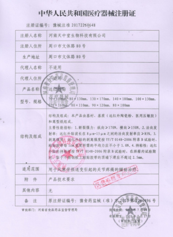 豫食藥監(jiān)械(準(zhǔn))字2012第2260270號/周口華東生物技術(shù)有限公司 有效期至:2016-10-22遠(yuǎn)紅外貼