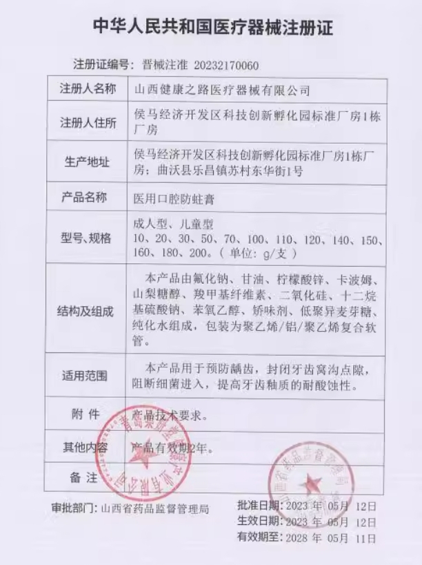吉械注準(zhǔn)20252170226/吉林省健正醫(yī)療器械有限公司 有效期至:2030-04-16醫(yī)用口腔防蛀膏