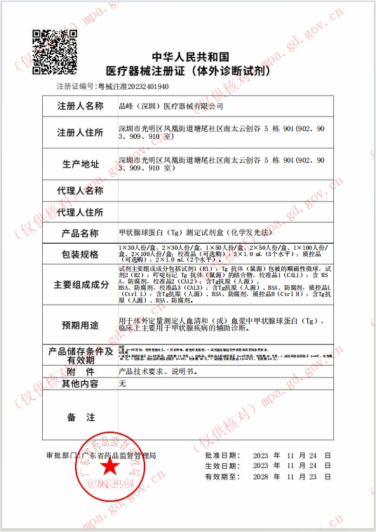 | 湖南醫(yī)用耗材擬掛產(chǎn)品公示(第五十九批) | 甲狀腺球蛋白(Tg)測定試劑盒(化學發(fā)光法) | 粵械注準20232401940 | 2×50人份/盒;校準品(可選購):3×1.0 mL(3個水平); | 3200 |