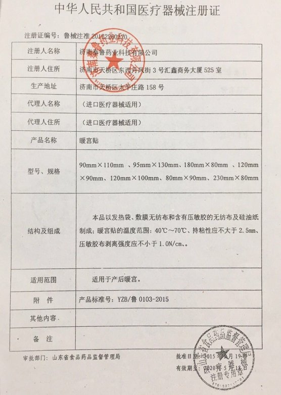 魯械注準20152090320/濟南秦魯藥業(yè)科技有限公司 有效期至:2025-04-05暖宮貼