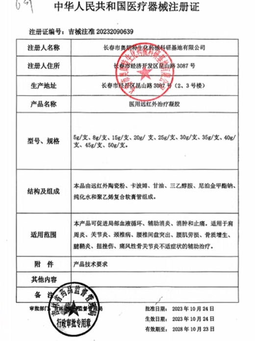 吉械注準(zhǔn)20242090370/吉林省國大生物制藥有限公司 有效期至:2029-07-17醫(yī)用遠(yuǎn)紅外治療凝膠