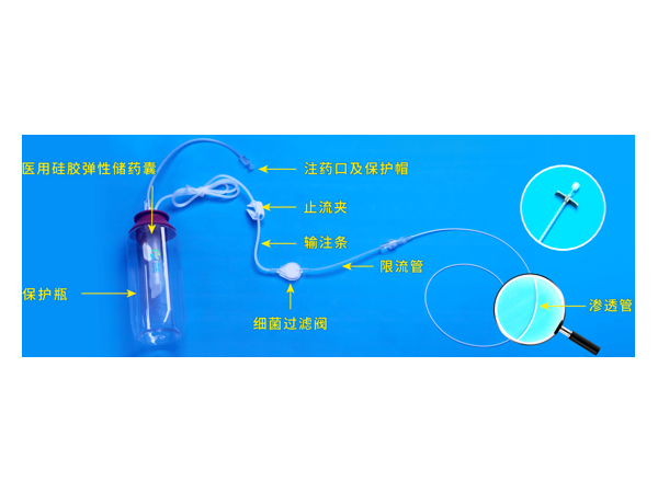 一次性使用術(shù)后局部麻醉鎮(zhèn)痛系統(tǒng)的結(jié)構(gòu)構(gòu)造分為三個(gè)部分:(1)輸注泵(儲(chǔ)液囊、加藥單向閥、輸液管路、藥液過濾器、止流閥、限流管組成);(2)滲透導(dǎo)管(導(dǎo)管、延長管及管座組成);(3)滲透導(dǎo)管導(dǎo)引鞘(可撕外鞘及穿刺針組成)。