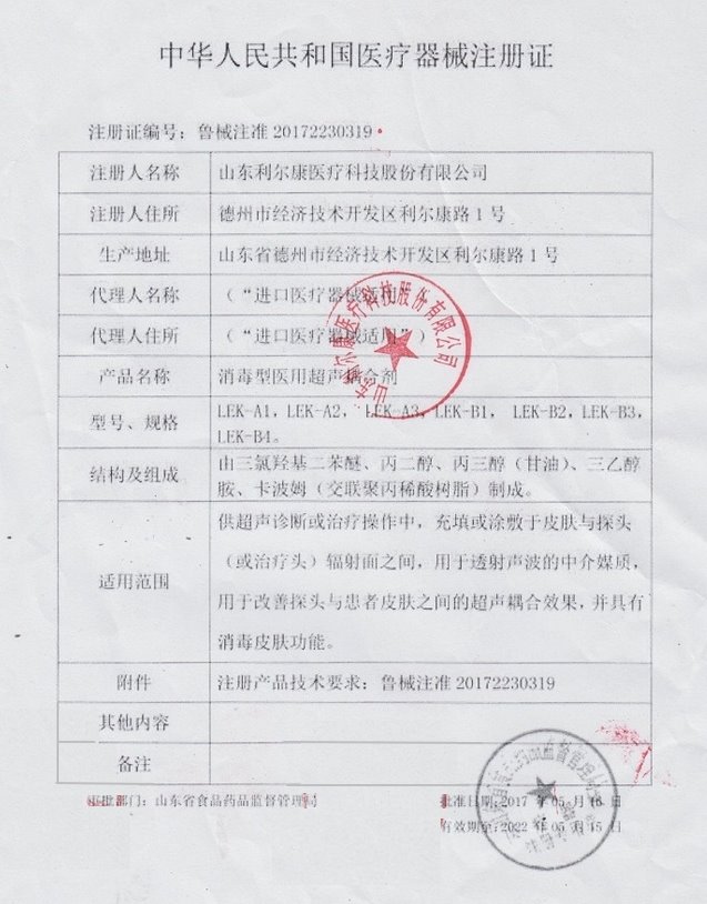鄂械注準(zhǔn)20162232407/湖北穆蘭同大科技有限公司 有效期至:2021-08-17消毒型醫(yī)用超聲耦合劑