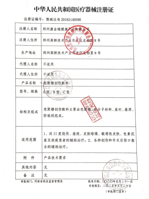 豫械注準(zhǔn)20162640025/鄭州康金瑞健康產(chǎn)業(yè)有限公司 有效期至:2021-01-27殼聚糖創(chuàng)傷敷料
