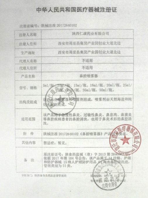 陜食藥監(jiān)械(準(zhǔn))字2013第2640082號(hào)/陜西仁康藥業(yè)有限公司 有效期至:2017-11-05鼻腔噴霧器