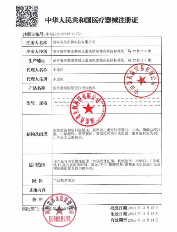 桂械注準(zhǔn)20242140048/廣西默士藥業(yè)有限公司 有效期至:2029-03-04醫(yī)用重組膠原蛋白液體敷料