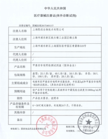 國械注準20163400960/萬華普曼生物工程有限公司 有效期至:2026-03-23甲基安非他明檢測試劑盒(膠體金法)