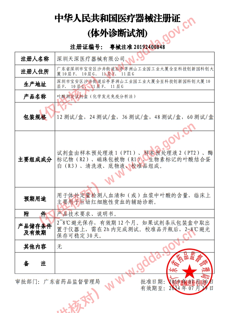 京械注準20172401078/北京泰格科信生物科技有限公司 有效期至:2022-10-25葉酸測定試劑盒(化學發(fā)光免疫分析法)