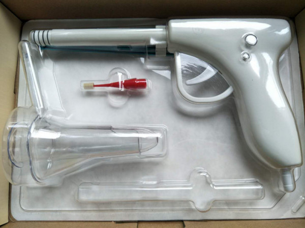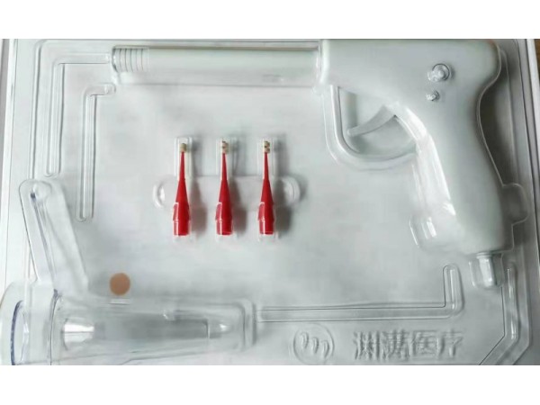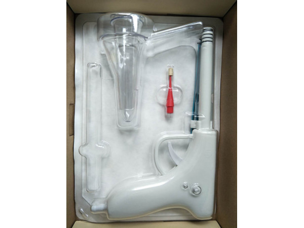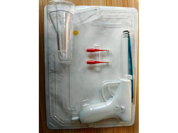 肛腸套扎器由槍體(內(nèi)置彈簧)、外槍管、內(nèi)槍管、硅膠圈(4個(gè))、負(fù)壓吸引接頭 、繞線輪、套扎器開關(guān)和蓋帽組成。其中槍體(內(nèi)置彈簧)、負(fù)壓吸引接頭、繞線輪采用ABS塑料制成,外槍管、內(nèi)槍管、套扎器開關(guān)和蓋帽采用軟聚氯乙烯制成,硅膠圈采用醫(yī)用硅橡膠制成。產(chǎn)品應(yīng)無菌。