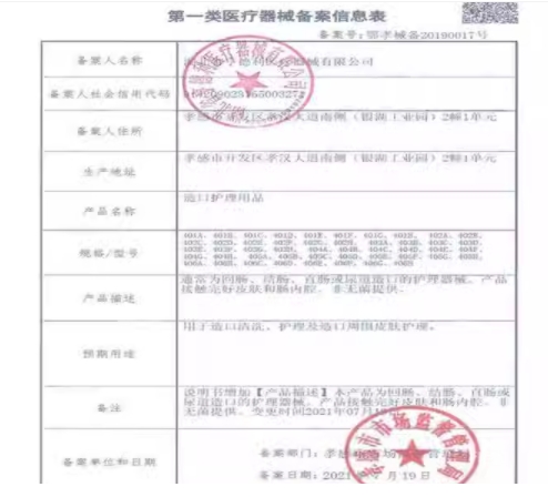 2025-02-06-備案人注冊地址由【孝感市開發(fā)區(qū)孝漢大道南側(cè)(銀湖工業(yè)園)2幢1單元】變更為【湖北省孝感市高新技術(shù)開發(fā)區(qū)孝漢大道南側(cè)(銀湖工業(yè)園)2幢和4幢】;備案日期由【2021-12-03】變更為【2025-02-06】;生產(chǎn)地址由【孝感市開發(fā)區(qū)孝漢大道南側(cè)(銀湖工業(yè)園)2幢1單元】變更為【湖北省孝感市高新技術(shù)開發(fā)區(qū)孝漢大道南側(cè)(銀湖工業(yè)園)2幢和4幢】; 2021-12-03-備案日期由\"2020-09-12\"變更為\"2021-07-19\" 型號/規(guī)格由\"401A、401B、401C、401D、401E、401F、401G、401H、 402A、402B、402C、402D、402E、402F、402G、402H、 403A、403B、403C、403D、403E、403F、403G、403H、 404A、404B、404C、404D、404E、404F、404G、404H、 405A、405B、405C、405D、405E、405F、405G、405H、 406A、406B、406C、406D、406E、406F、406G、406H\"變更為\"編碼位 代表類型 第1位 “4”代表造口護(hù)理用品 第2、3位 “01”代表防漏條;“02”代表防漏圈; “03”代表防漏貼環(huán),“04”代表造口底盤黏膠剝離噴劑,“05”造口底盤黏膠剝離片劑,“06”代表造口清香劑, “07”代表造口皮膚清洗劑 第4位 “A、B、C……X、Y、Z” 26個字母代表序號\",備案日期由\"2021-07-19\"變更為\"2021-12-03\" 2021-12-03-備案日期由\"2020-09-12\"變更為\"2021-07-19\" 型號/規(guī)格由\"401A、401B、401C、401D、401E、401F、401G、401H、 402A、402B、402C、402D、402E、402F、402G、402H、 403A、403B、403C、403D、403E、403F、403G、403H、 404A、404B、404C、404D、404E、404F、404G、404H、 405A、405B、405C、405D、405E、405F、405G、405H、 406A、406B、406C、406D、406E、406F、406G、406H\"變更為\"編碼位 代表類型 第1位 “4”代表造口護(hù)理用品 第2、3位 “01”代表防漏條;“02”代表防漏圈; “03”代表防漏貼環(huán),“04”代表造口底盤黏膠剝離噴劑,“05”造口底盤黏膠剝離片劑,“06”代表造口清香劑, “07”代表造口皮膚清洗劑 第4位 “A、B、C……X、Y、Z” 26個字母代表序號\",備案日期由\"2021-07-19\"變更為\"2021-12-03\" 2021-07-19-備案日期由\"2020-09-12\"變更為\"2021-07-19\" 2021-07-19-備案日期由\"2020-09-12\"變更為\"2021-07-19\"