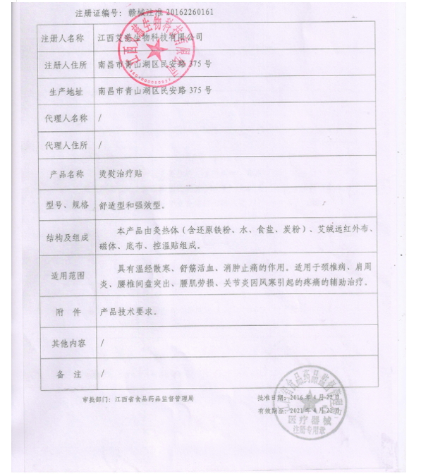 蘇械注準(zhǔn)20192200837/江蘇艾澤生物科技有限公司 有效期至:2029-08-20燙熨治療貼