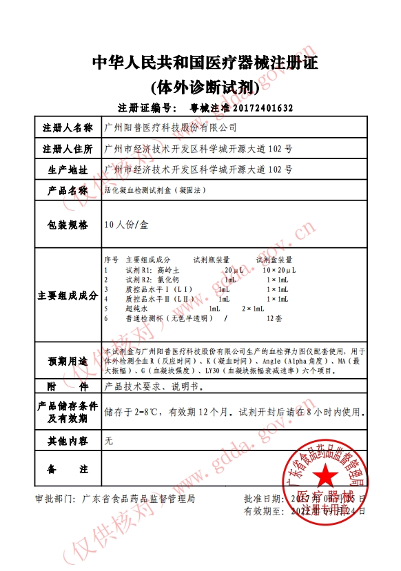 本試劑盒與廣州陽普醫(yī)療器械有限公司生產的血栓彈力圖儀配套使用,用于體外檢測全血R(反應時間)、K(凝血時間)、Angle(Alpha角度)、MA(最大振幅)、G(血凝塊強度)、LY30(血凝塊振幅衰減速率)六個項目。