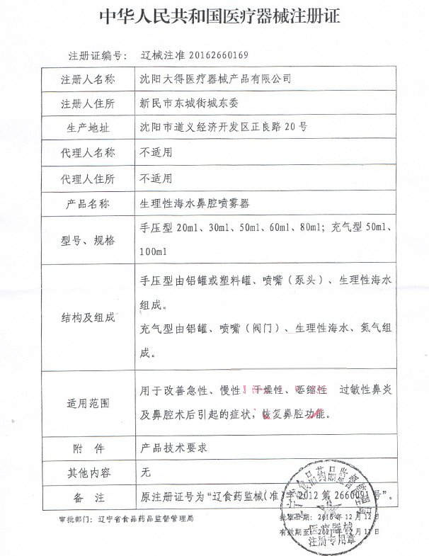遼食藥監(jiān)械(準(zhǔn))字2012第2660091號/沈陽大得醫(yī)療器械產(chǎn)品有限公司 有效期至:2016-11-13生理性海水鼻腔噴霧器