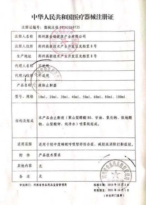 蘇械注準(zhǔn)20182141535/江蘇求恒醫(yī)療器械有限公司 有效期至:2028-11-12液體止鼾器