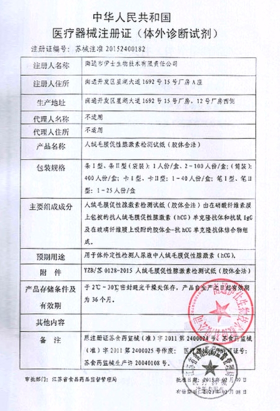 蘇械注準(zhǔn)20152400098/南通戴爾諾斯生物科技有限公司 有效期至:2029-11-11人絨毛膜促性腺激素檢測(cè)試紙(膠體金法)