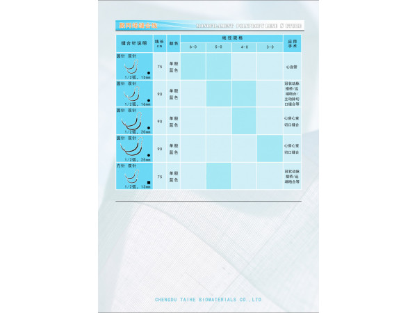 產品主要是采用蠶絲、合成纖維(聚酯、聚酰胺、聚丙烯)為材料的醫(yī)用手術縫合線。VS系列:由天然蠶絲多股編織而成,通常染色成黑色。PE系列:由聚酯纖維多股編織而成,通常白色或染色成綠色。NL系列:由聚酰胺6(尼龍)纖維單絲構成或多股編織而成,通常染色成藍色或黑色。PP系列:由聚丙烯單絲構成,通常染色成藍色。以上系列均可配針或不配針,配針可以是單針或雙針。所配縫針為300不銹鋼激光打孔針。產品經(jīng)環(huán)氧乙烷滅菌,無菌。