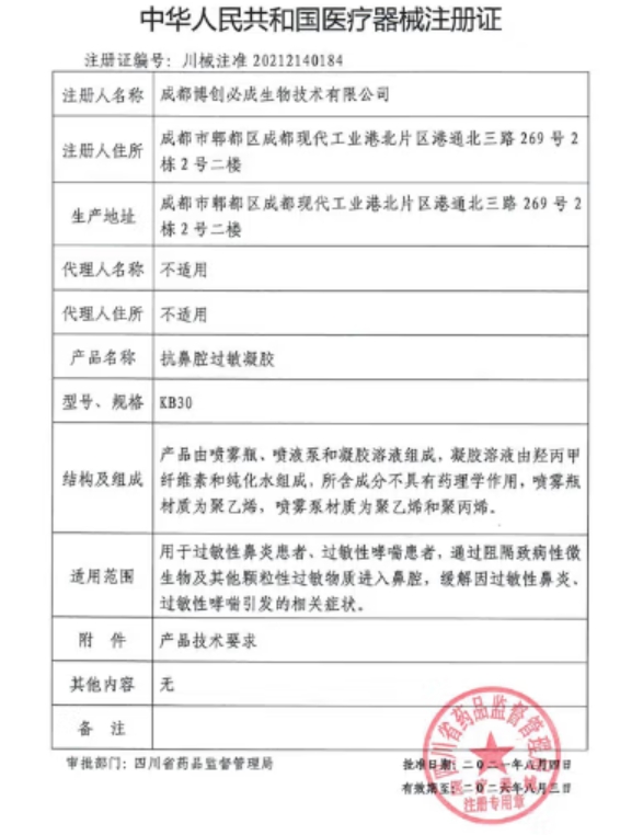 吉械注準20222140615/岐伯醫(yī)藥(吉林)有限公司 有效期至:2027-08-17抗鼻腔過敏凝膠