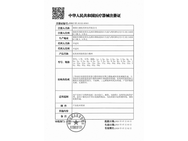 湘械注準20242140420/啟貞藥業(yè)(湖南)有限公司 有效期至:2029-05-27醫(yī)用重組膠原蛋白敷料