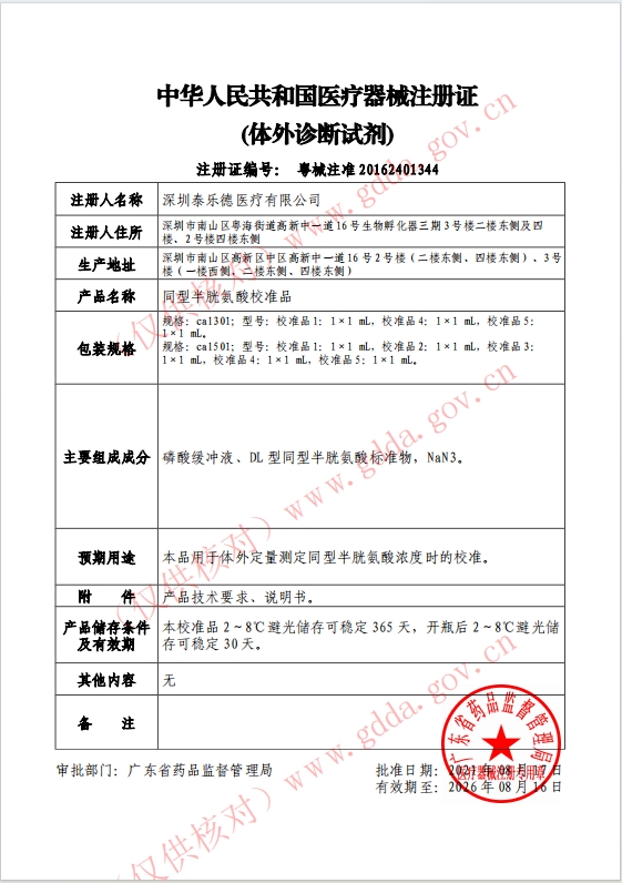 浙械注準(zhǔn)20162400320/嘉興博泰生物科技發(fā)展有限公司 有效期至:2021-05-17同型半胱氨酸校準(zhǔn)品