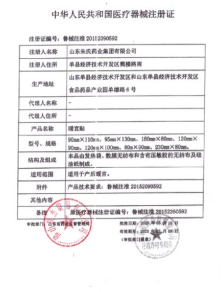 魯械注準(zhǔn)20152090685/山東朱氏堂醫(yī)療器械有限公司 有效期至:2025-03-11暖宮貼