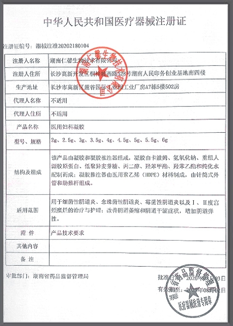 湘械注準(zhǔn)20212180942/湖南天根樂(lè)微君科技有限公司 有效期至:2026-06-02醫(yī)用婦科凝膠