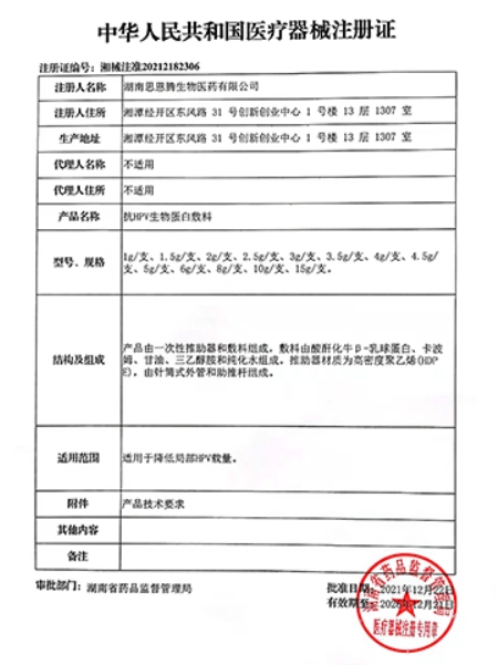 湘械注準(zhǔn)20232180919/湖南一零一醫(yī)療科技有限公司 有效期至:2028-09-18抗HPV生物蛋白敷料