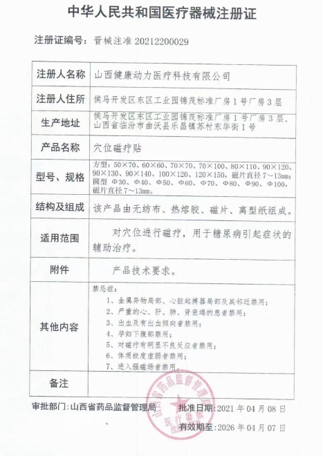 晉械注準2020220001/山西健康動力醫(yī)療科技有限公司 有效期至:2025-01-08穴位磁療貼